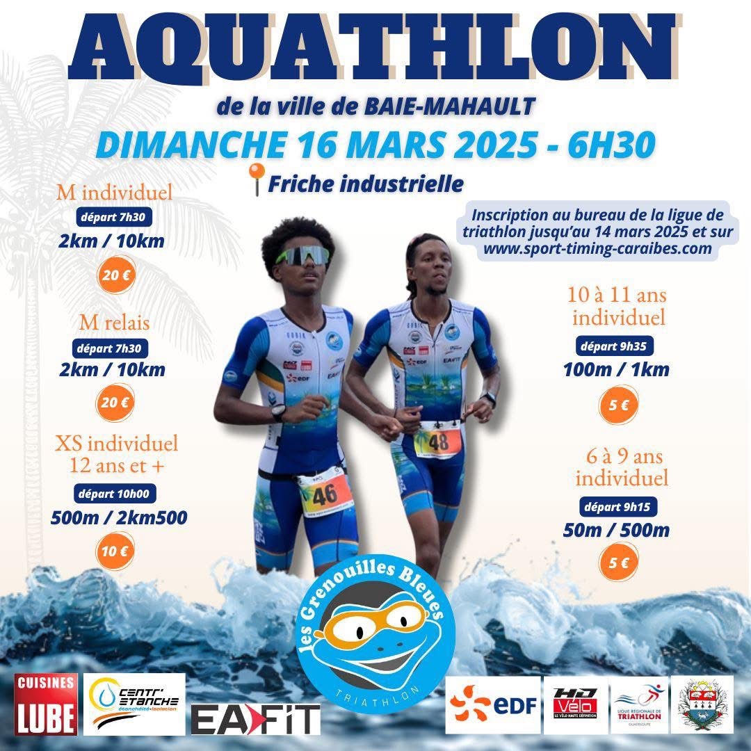 Hélène POLIFONTE, Maire de la Ville de Baie-Mahault, informe la population que dans le cadre de l’Aquathlon organisé par l’Association des Grenouilles bleues, prévue ce dimanche 16 mars 2025, la circulation et le stationnement seront interdits de 6h30 jusqu’à la fin de la manifestation :
