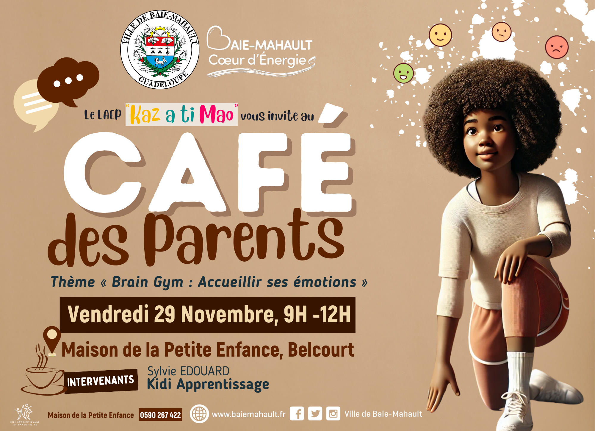 Le LAEP “Kaz a ti Mao” vous invite à un Café des Parents, un moment de partage et d’échange autour du thème “Brain Gym : Accueillir ses émotions”. Cet atelier est spécialement conçu pour accompagner les parents dans la gestion des émotions, leur permettant de mieux comprendre et soutenir leurs enfants au quotidien.