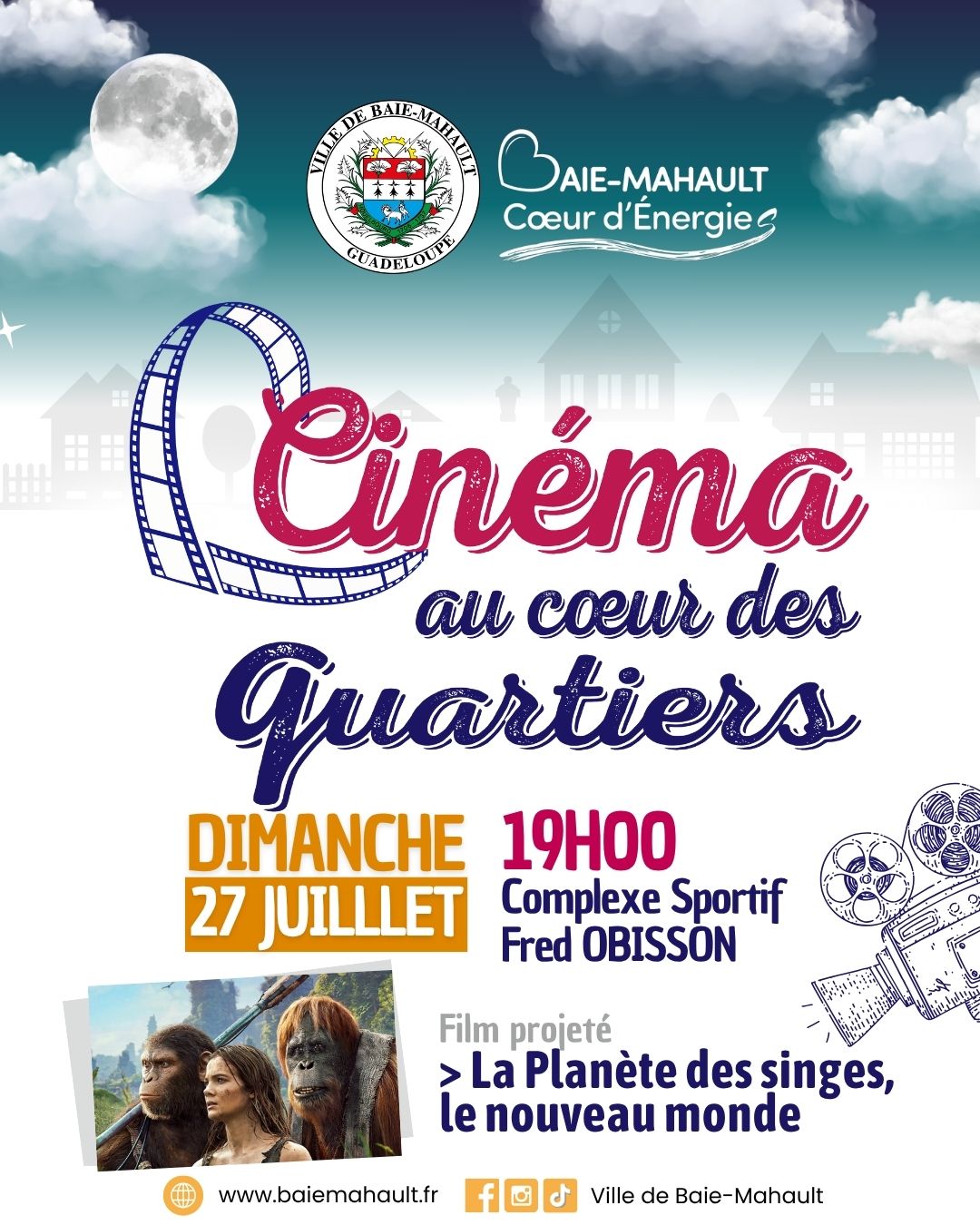 La Ville de Baie-Mahault vous invite à une nouvelle séance en plein air dans le cadre de l’opération « Cinéma au cœur des quartiers ». Venez (re)découvrir La Planète des singes, le nouveau Royaume, un film palpitant à partager en famille ou entre amis.