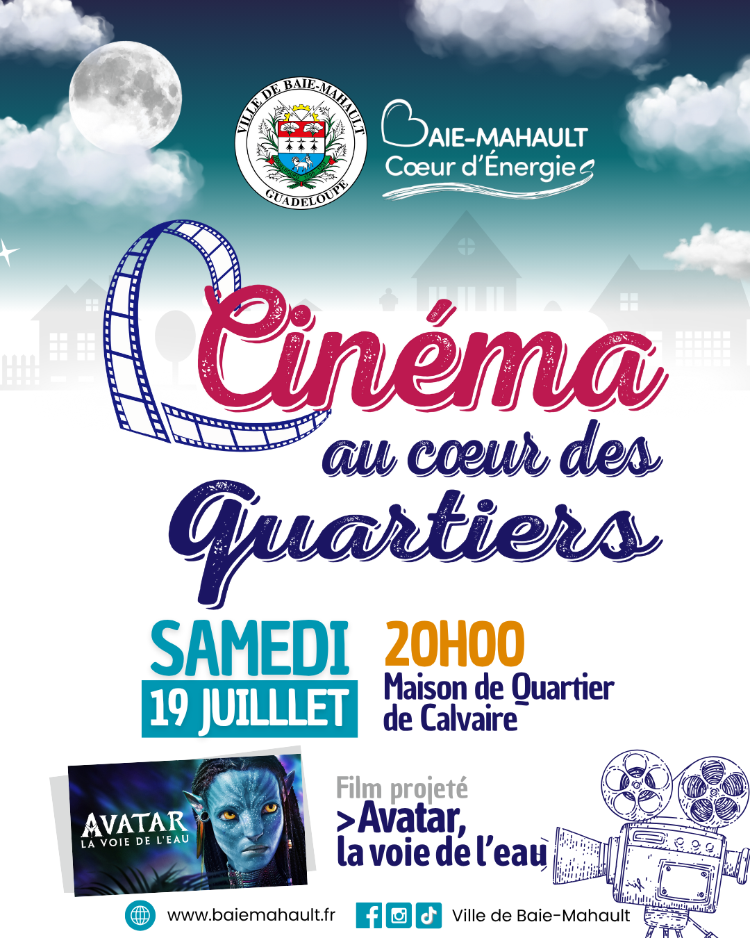 La Ville de Baie-Mahault vous invite à une nouvelle séance en plein air dans le cadre de l’opération « Cinéma au cœur des quartiers ». Venez (re)découvrir “Avatar, la voie de l’eau”, un film palpitant à partager en famille ou entre amis.