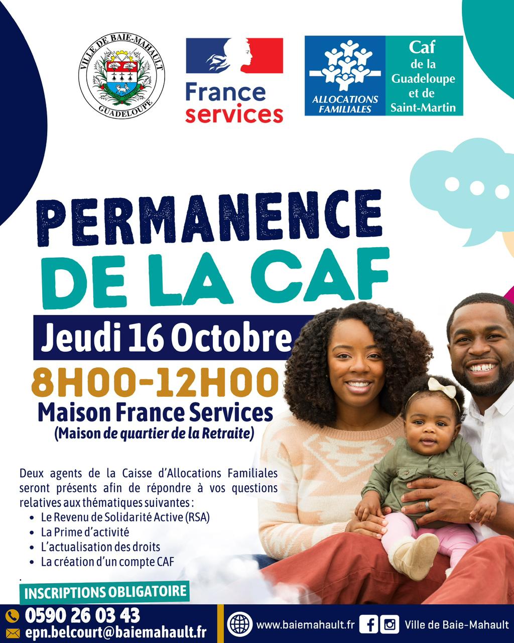Le jeudi 16 octobre 2025, de 8h à 12h, la CAF de la Guadeloupe et de Saint-Martin tiendra une permanence d’accueil à la Maison France Services, située à la Maison de quartier de La Retraite, à Baie-Mahault.