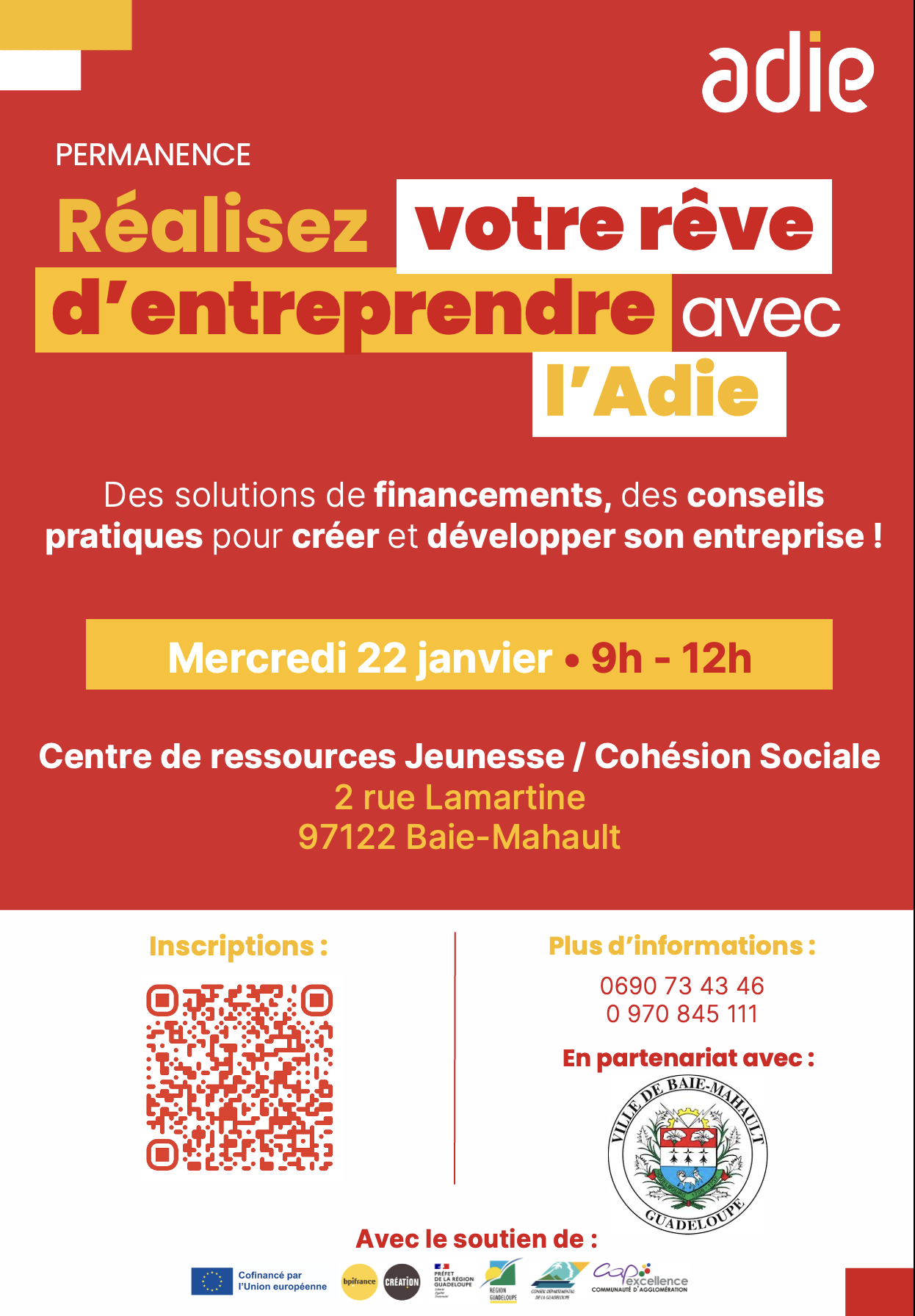 La Ville de Baie-Mahault vous invite à la prochaine permanence avec l’Adie qui aura lieu ce mercredi 22 janvier, de 9h à 12h, au Centre de Ressources Jeunesse !